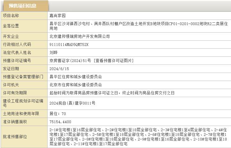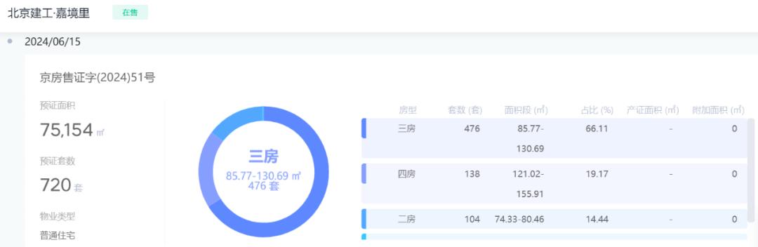 北京建工·嘉境里于今年6月15日取得预售证,6月23日开盘,共推出11栋720套房源,住宅面积7.52万m²,总建面积15.44万m²,绿化率35 %,容积率2.34,面积段为74.33-80.46m²的二房有104套,面积段为85.77-130.69m²的三房有476套,面积段为121.02-155.91m²的四房有138套。