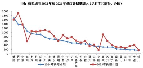 可以看到,对比2023年的供地,2024年典型城市商住办土地供应总量较同比下降了16%,供地计划明显削减。典型如南京、深圳、苏州、西安等城市,同比降幅超过了40%以上,供地计划收缩程度十分突出