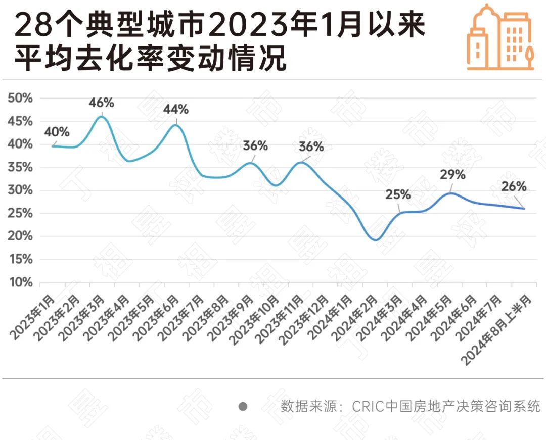 CRIC监测数据,2024年8月上半月28城平均去化率仅为26%,与7月基本持平。从趋势来看,2023年1月至今,整体去化率已由2023年大体保持35%以上水平降至目前30%以下水平,整体去化率波峰也已由2023年高点46%降至2024年5月29%。