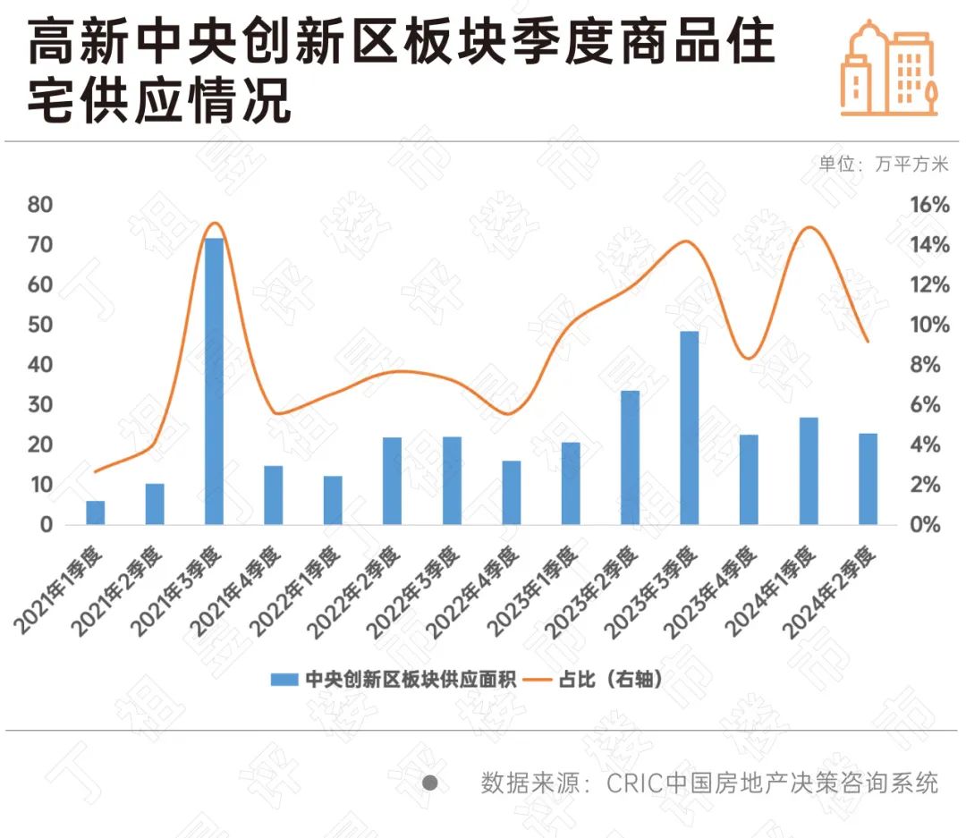 以西安某项目为例,该项目6月29日开盘,认购均价27154元/平方米,推出套数153套,最终仅认购15套,去化率10%,比西安7月平均去化率低34pcts。项目所处的高新中央创新区板块一直是新房供应的主力片区,尤其是自2023年以来,整体新房供应占比一直在15%左右波动。