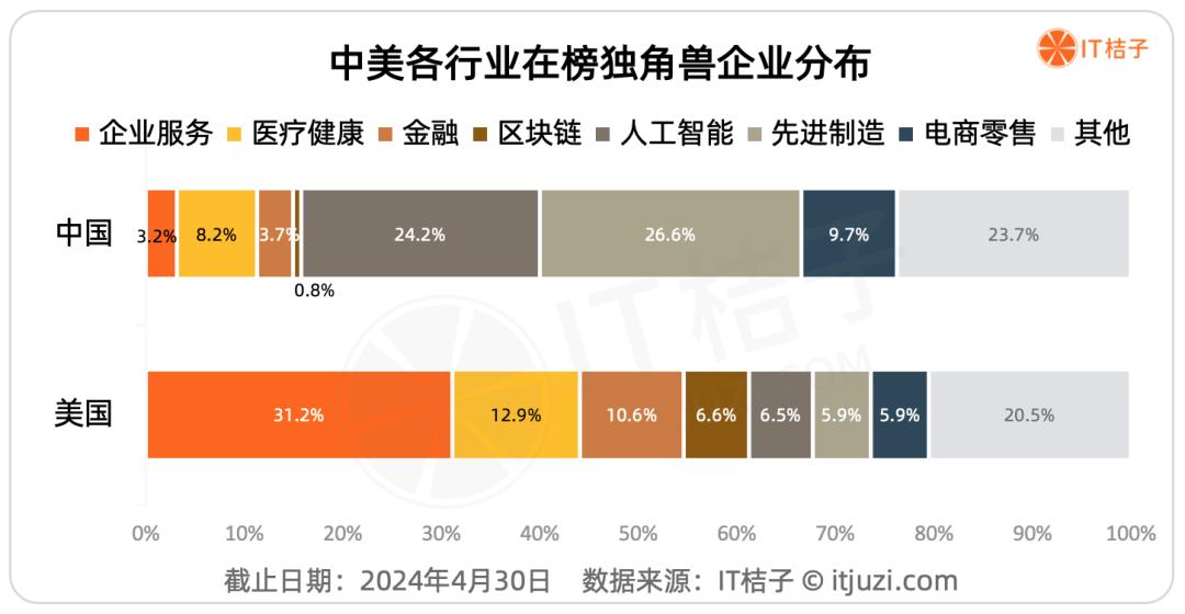 IT 桔子数据显示,中国在榜独角兽最多的是先进制造业,占比 26.6%;第二多的是人工智能行业,占比 24.2%;第三多的是电商零售业,占比 9.7%;再之后是医疗和金融。