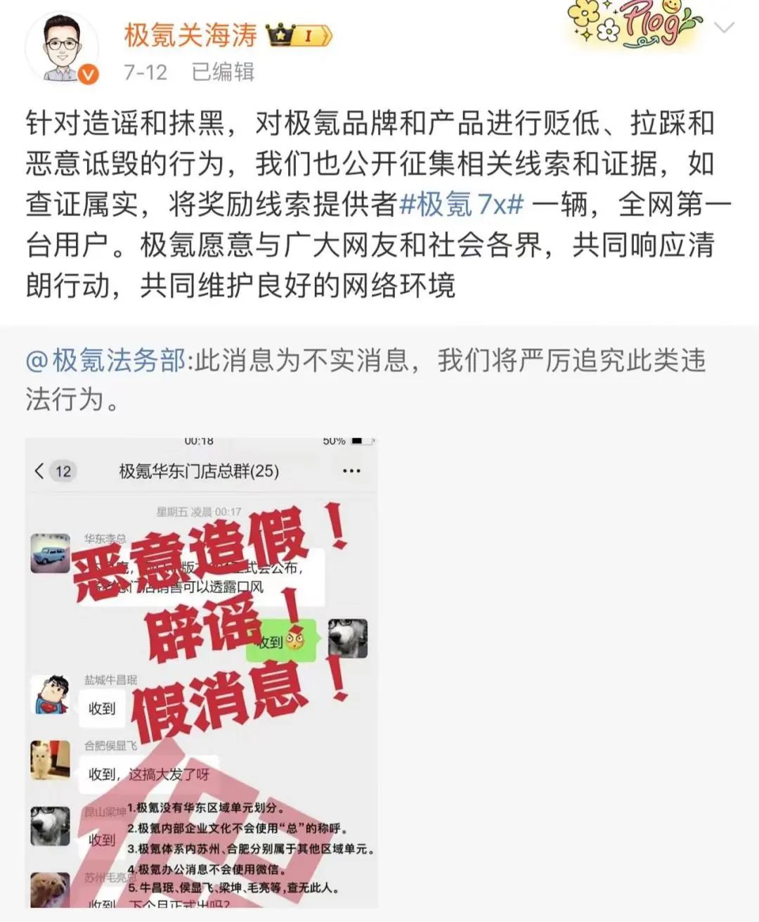 《IT时报》记者在极氪智能科技CMO关海涛的微博中发现,7月12日,其转发极氪法务部的一条微博并进行辟谣,内容为一张微信群截图,声称7月底极氪将推出最新款车型。这条微博被不少2024款车主视为官方辟谣的直接证明。