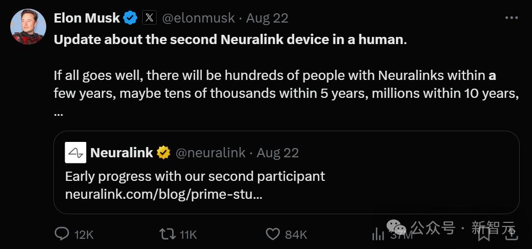 一切顺利的话,几年内将有几百人植入Neuralink脑机接口,5年内会有数万人,10年内会有数百万人。