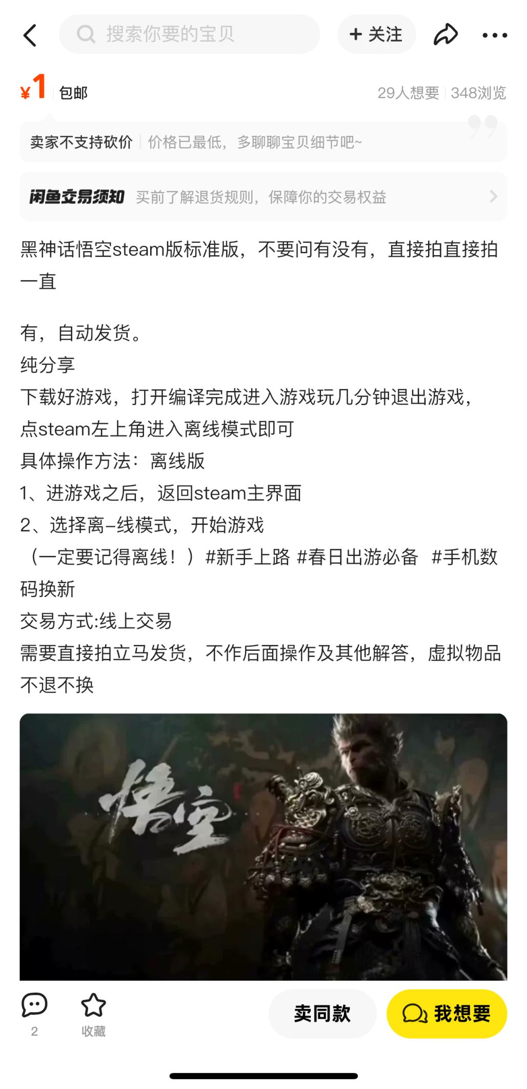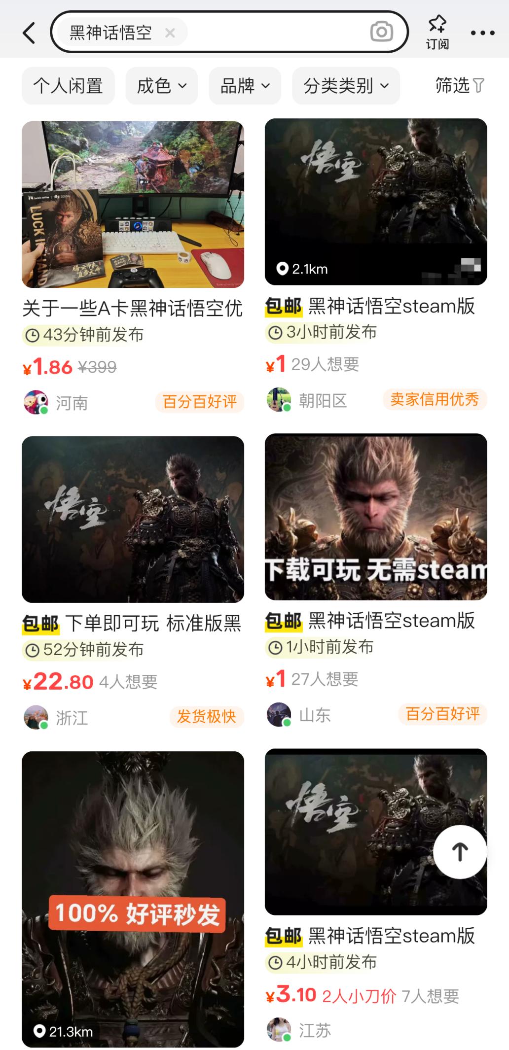 科技旋涡发现,在多个交易平台上涌现出大量低价出售《黑神话:悟空》盗版的交易信息,如“1元黑悟空下载即玩”和“9.9元畅玩黑神话”等介绍。而实际上,这些低价游戏基本上除了欺骗之外,还有一种账号共享的行为存在。对于这种盗版、账号租借和共享行为,实际上存在着诸多问题。