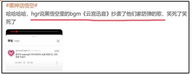 此前还有韩国网友认为《黑悟空》里的bgm《云宫讯音》是抄袭了韩国组合防弹少年团的歌曲。更离谱的是,海外博主居然质疑《黑神话》抄袭美国某款游戏,实在令人啼笑皆非。