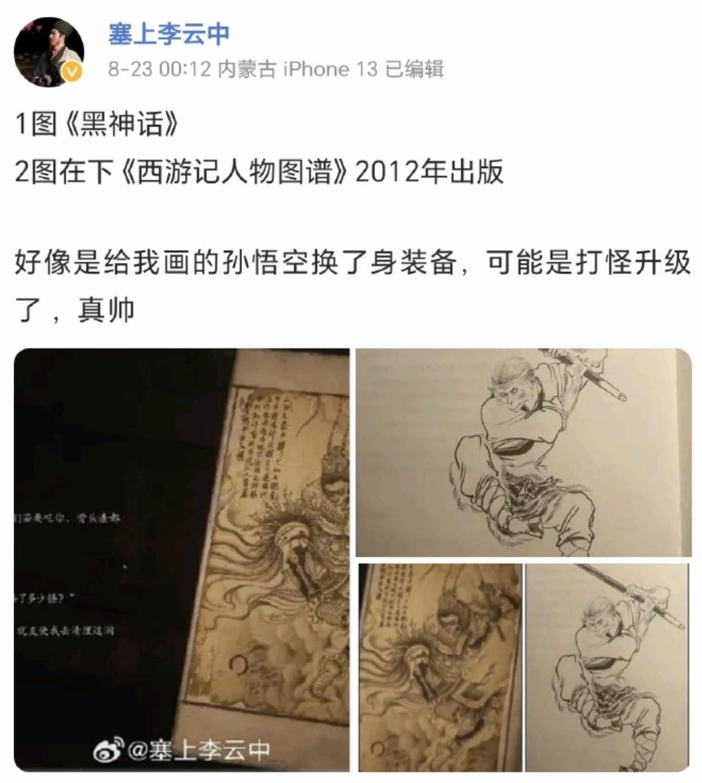 8月23日,“塞上李云中”发布微博,附上了《黑神话:悟空》中的“大圣残躯”篇的图片,与其在2012年出版的《西游记人物图谱》中的孙悟空姿势相近,称“好像是给我画的孙悟空换了身装备”。