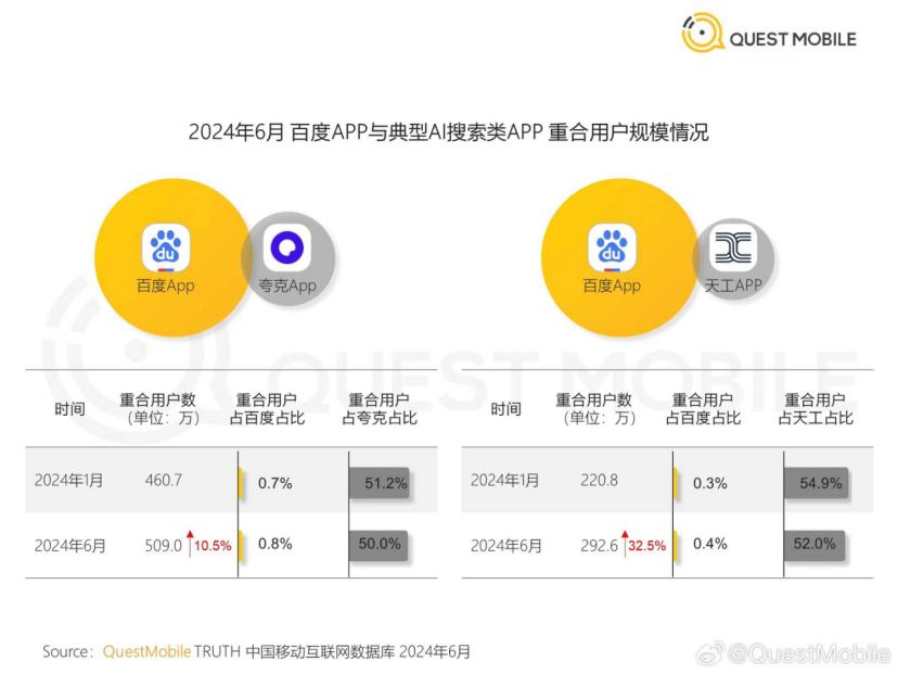 还有一个有意思的现象,据Quest Mobile数据,使用新AI搜索类APP与使用百度APP的用户出现了高度重合的现象。以天工APP为例,今年1月份两者的重合用户数为220.8万,到6月份增长32.5%至292.6万。但在各自重合用户占比上却出现了“剪刀差”,重合用户占百度比例上升,占天工比例反而下降。