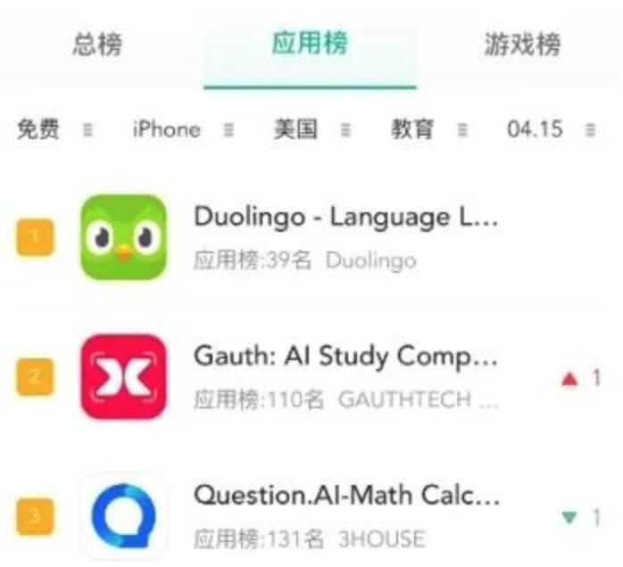 其实,自今年年初以来,Question AI和Gauth就已经是美区应用商店下载排行榜的常客,巅峰时期更是双双跃居教育类应用前三,成为仅次于多邻国的热门教育APP。