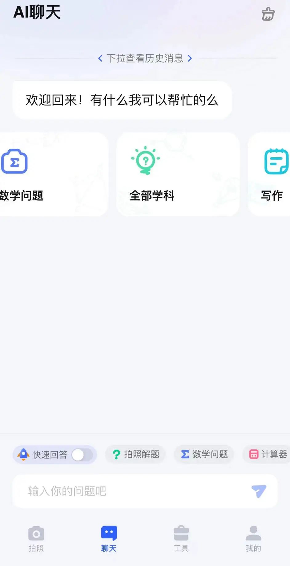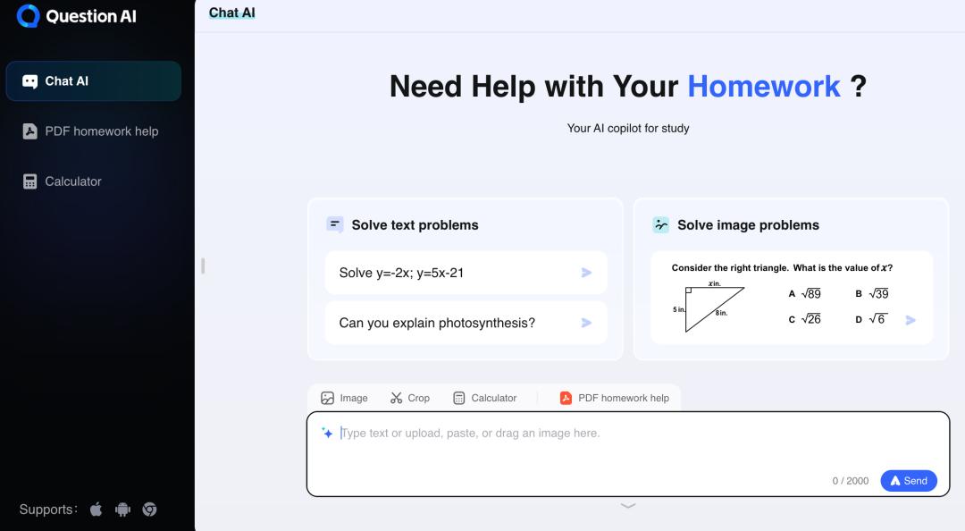 与传统的拍照搜题应用相比,Question AI将AI对话的权重提得更高,无论是网页端还是APP端,最先引导用户使用的都是自己的对话功能,与Guath的全学科覆盖类似,Question AI同样支持多门学科解题,只需要通过在对话框输入相关的问题或者上传资料即可。