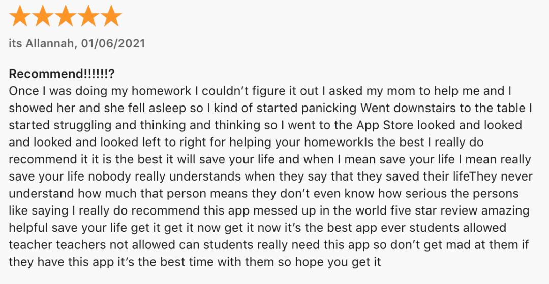 这对于很多家里人没能力辅导作业,又请不起家教的美国小孩来说简直就是天降神兵,挽作业于既倒、扶考试之将倾,在应用商店评论区底下,用户们纷纷表达对这两款APP的感激之情。