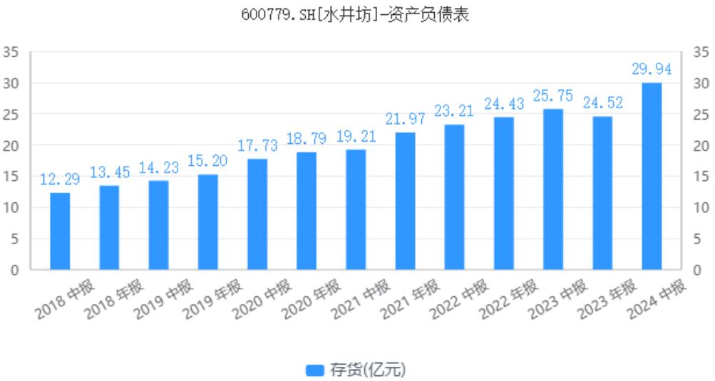另外,上半年水井坊经营性现金流净额为-2.93亿元,去年同期为1.3亿元左右。这其中,存货金额的增长以及合同负债的减少成为公司经营性现金流同比由正转负的两个原因。半年报显示,截至2024年6月末,水井坊存货金额同比增长16%至30.32亿元,再创历史新高;同期,公司合同负债则至10.71亿元,同比下滑1.36%。