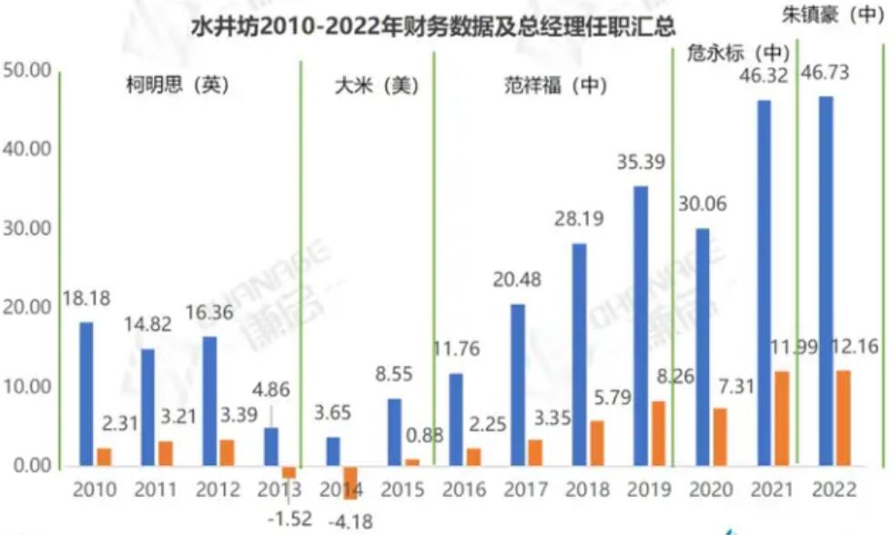 相比前三任中国本土总经理,新上任的洋人总经理艾恩华业绩表现明显欠佳。2022年-2023年,水井坊营收、归母净利润仅为个位数的增长,明显在上市白酒企业中垫底,也明显落后于其他五朵“川酒金花”。