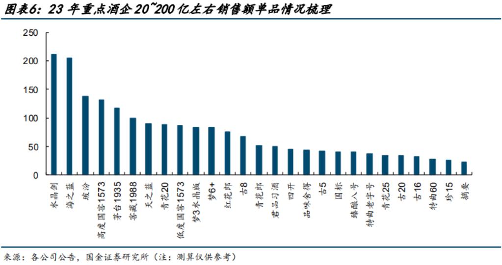 近些年,大单品策略成为白酒企业布局的重点,水井坊核心单品臻酿八号也取得了一定的成绩。不过,与郎酒、古井贡酒等竞品多点开花不同的是,水井坊只有臻酿八号一款产品进入到泛全国化大单品之列。据国金证券研究数据,2023年重点企业20-200亿元大单品中,剑南春旗下水晶剑、洋河旗下海之蓝规模已经达到200亿元;水井坊只有臻酿八号一款产品入选,排名仅为第20位。对比看,洋河、郎酒、古井贡酒等地方品牌均有多款产品入选。