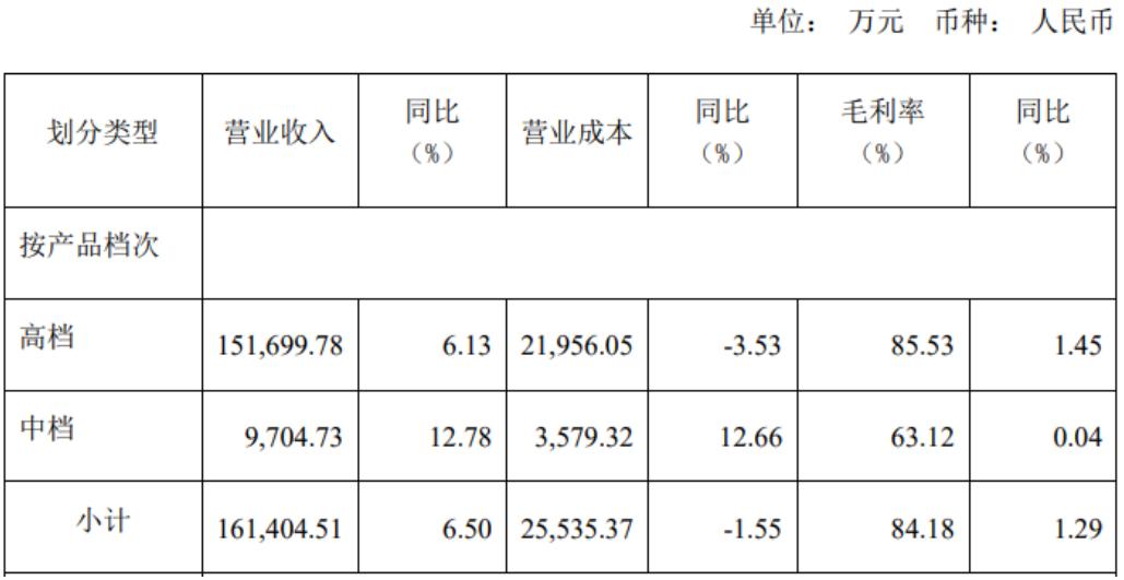 分产品来看,水井坊高档产品实现营收15.17亿元,同比增长6.13%,毛利率为85.53%,同比提升1.45个百分点;中档产品实现营收9704.73万元,同比增长12.78%,毛利率为63.12%,同比增长0.04个百分点。