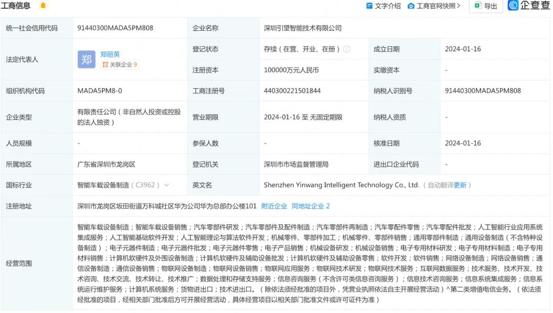 深圳引望智能技术有限公司成立于今年1月16日,由华为技术有限公司全资持股,注册资本为10亿元人民币,从事汽车智能系统及部件解决方案研发、设计、生产、销售和服务,主要业务范围包括汽车智能驾驶解决方案、汽车智能座舱、智能车控、智能车云、智能车载光等。