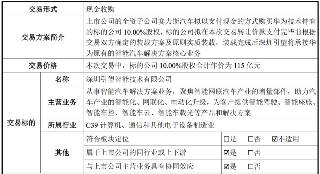 8月25日,赛力斯集团股份有限公司(简称“赛力斯”)发布《关于筹划对外投资的进展公告》(简称“公告”)称,旗下子公司赛力斯汽车有限公司(简称“赛力斯汽车”)将以支付现金的方式购买华为技术有限公司(简称“华为”)持有的深圳引望智能技术有限公司(简称“引望”)10%股权,交易金额为人民币115亿元。