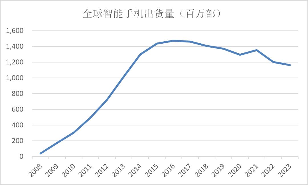早在2016年,全球智能手机出货量就触及了历史顶点的14.7亿部,然后开启了一路钝刀子割肉般的下滑。在长达7年的下滑过程中,只有苹果依靠华为被制裁,部分证明了自己的品牌价值和护城河。