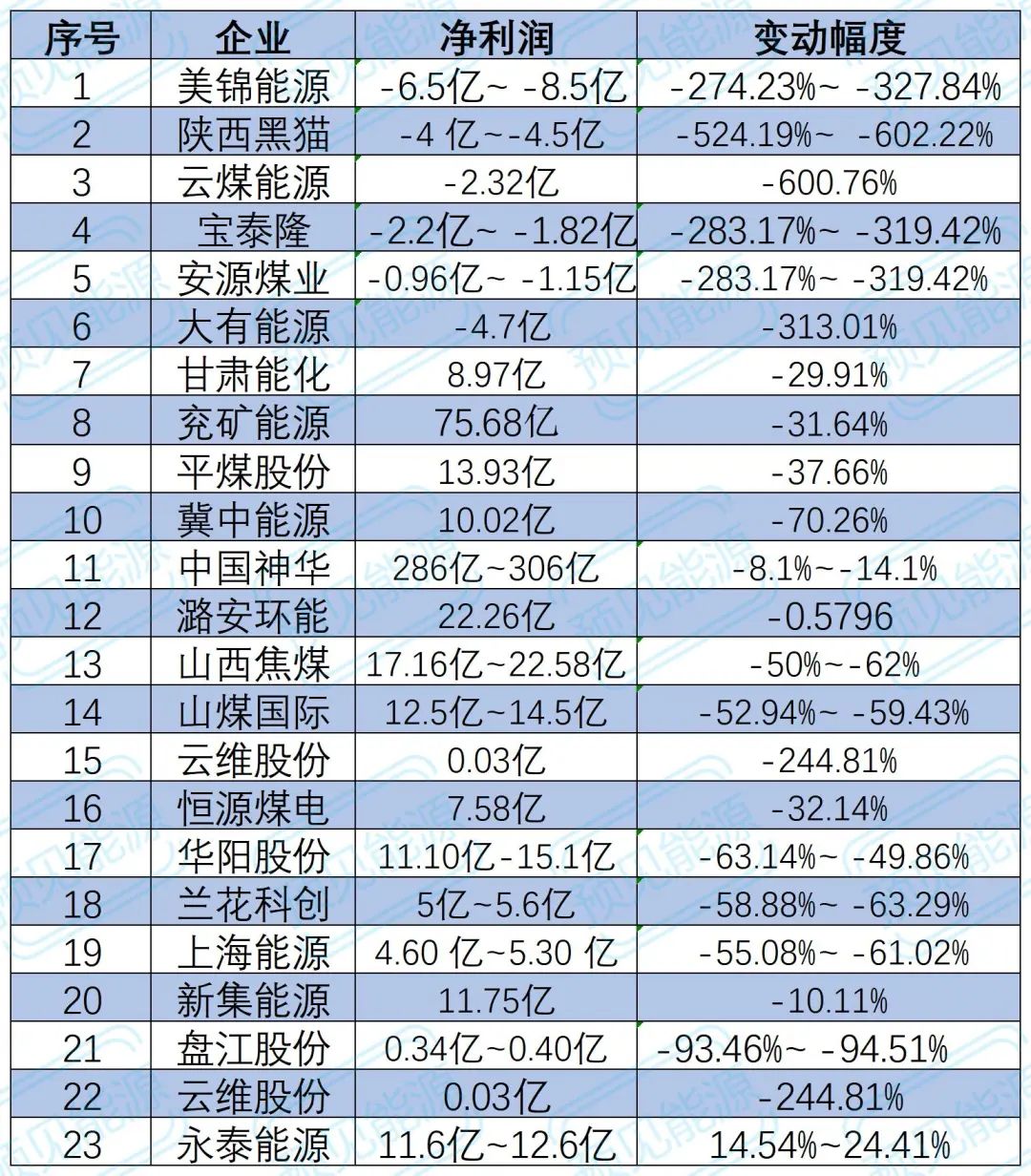 此外,归母净利润下跌幅度超过100%的企业共有7家,分别是 云煤能源 (下跌562.36%至640.64%)、 陕西黑猫 (下跌524.19%至602.22%)、 宝泰隆 (下跌425.36%至493.29%)、 美锦能源 (下跌274.23%至327.84%)、 安源煤业 (下跌283.17%至319.42%)、 大有能源 (下跌313.01%)、 云维股份 (下跌244.81%)。