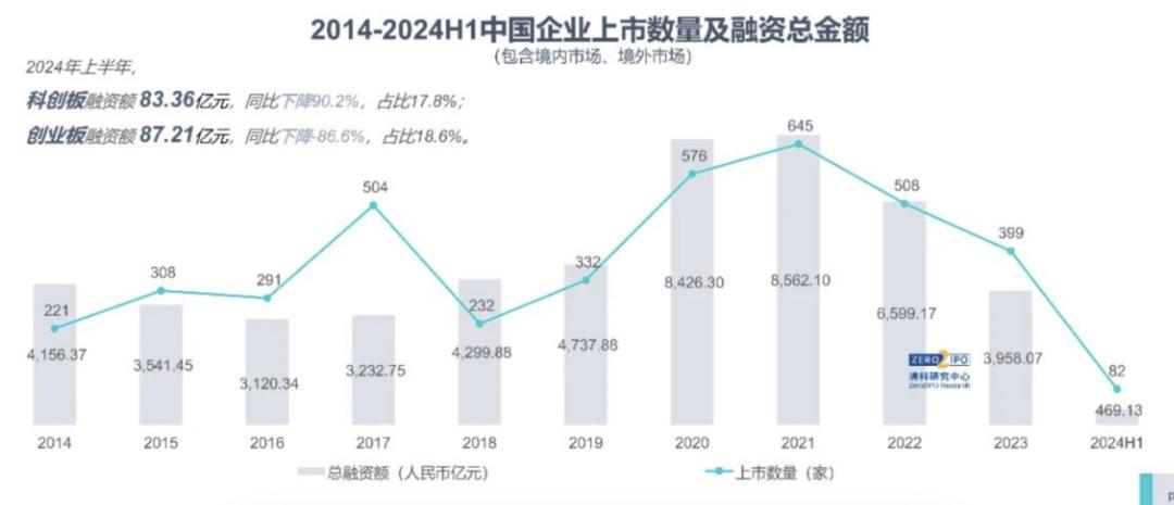 其中,VC/PE较为依赖的退出路径——IPO渐渐变得遥远。2024年上半年仅有82家中企上市,同比下降62.4%,境外和A股被投企业IPO案例数同比分别下降20.1%、74.1%。