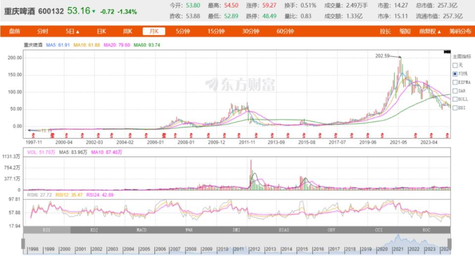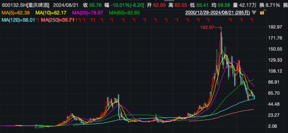 二级市场方面,2013年宣布收购计划前,重庆啤酒股价为12.64元/股,嘉士伯入主后,2021年7月,重庆啤酒股价最高曾摸到192.97元/股,不过如今股价已回落到53元左右。