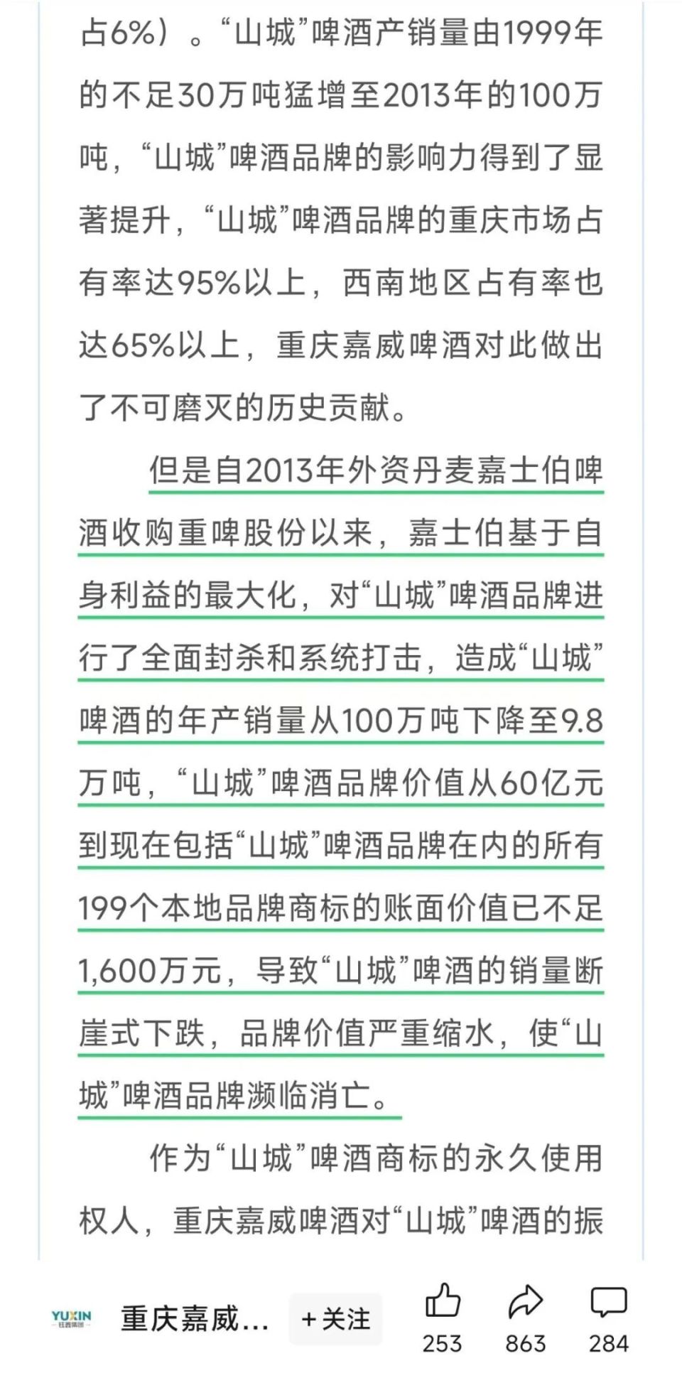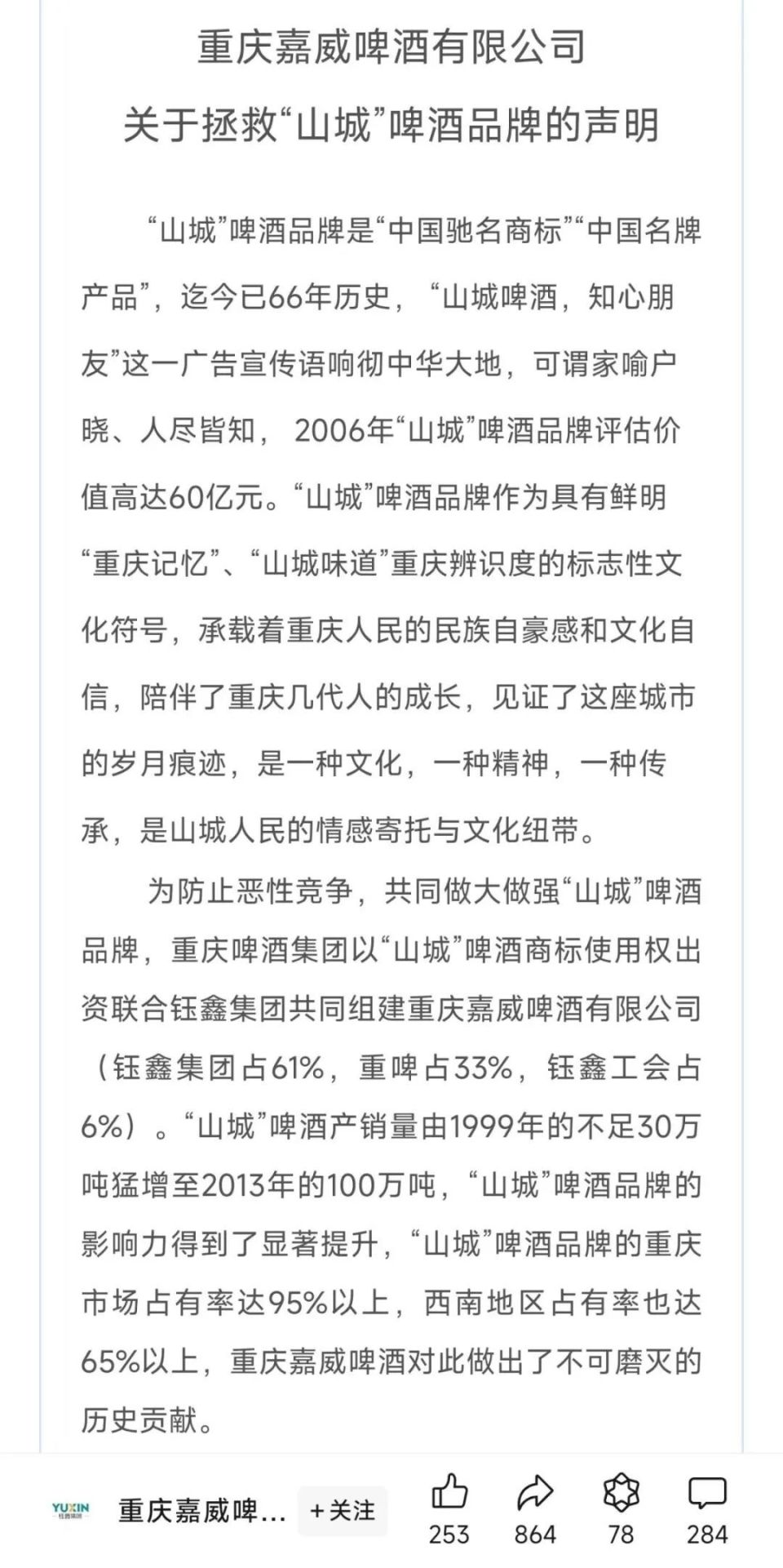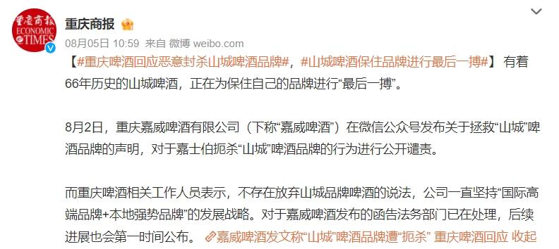 而在半年度业绩发布之前,山城啤酒的生产商重庆嘉威啤酒有限公司(下称“重庆嘉威”)在其公众号发布了一篇题为《重庆嘉威啤酒有限公司关于拯救“山城”啤酒品牌的声明》的“檄文”,将矛头直指重庆啤酒实控人——外资啤酒巨头嘉士伯;其认为“嘉士伯基于自身利益的最大化,对‘山城’啤酒品牌进行了全面封杀和系统打击”。