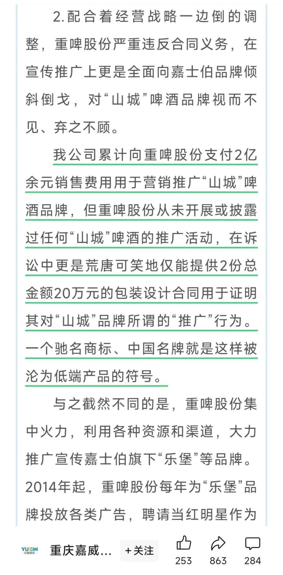 重庆嘉威称,公司累计向重庆啤酒支付2亿余元销售费用,用于营销推广“山城”啤酒品牌,但其从未开展或披露过任何“山城”啤酒的推广活动,在诉讼中更是仅能提供2份总金额20万元的包装设计合同用于证明其对“山城”品牌所谓的“推广”行为。