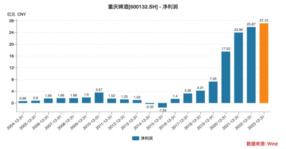 数据显示,2013年,嘉士伯刚刚接手时,重庆啤酒的净利润只有1.02亿元;到了2023年,重庆啤酒净利润27.12亿元,十余年间翻了26倍。