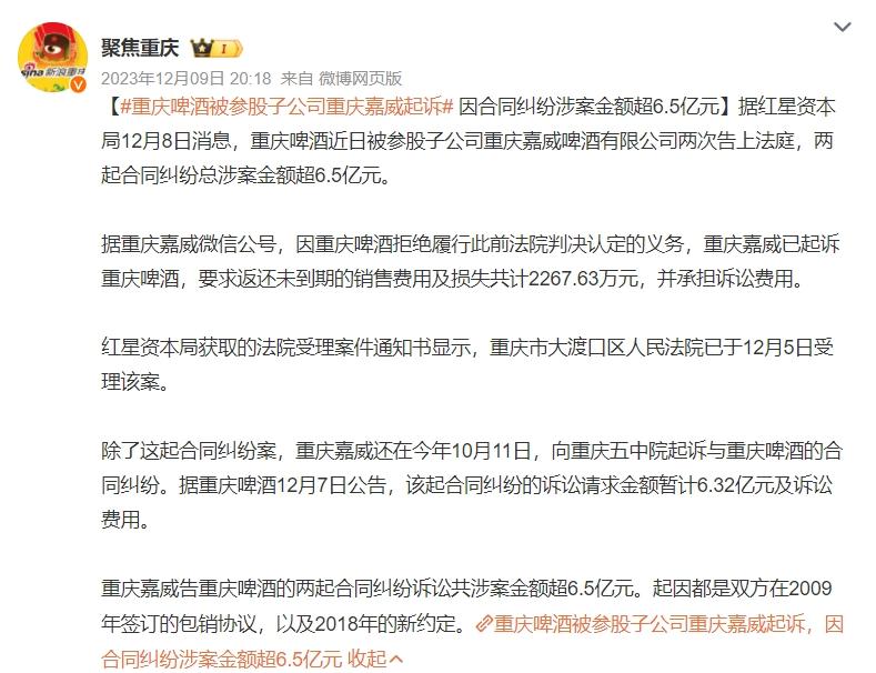 2022年,重庆嘉威撤诉,但矛盾并未缓解。2023年12月,重庆嘉威再次对重庆啤酒提起诉讼,要求赔偿各项经济损失6.32亿元,重庆啤酒表示,此次是重庆嘉威在2022年撤诉之后就相同合同、基本相同的理由再更换法院提起诉讼。