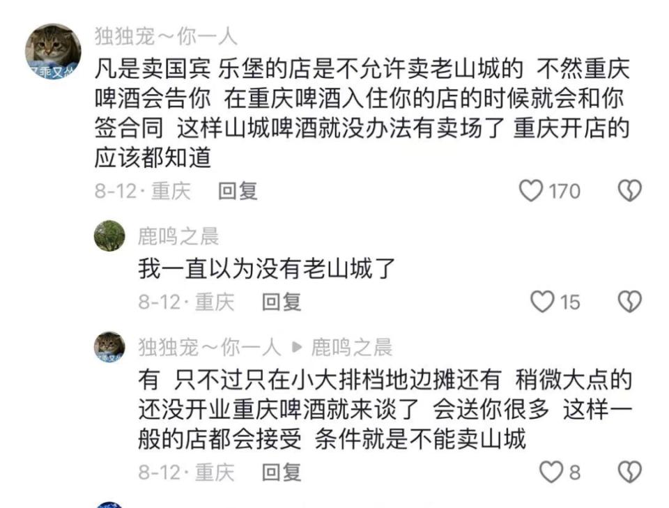 还有重庆网友表示,“凡是卖国宾、乐堡的店是不允许卖老山城的,不然重庆啤酒会告你,在重庆啤酒入住你的店的时候就会和你签合同,这样山城啤酒就没办法有卖场了,重庆开店的应该都知道。”