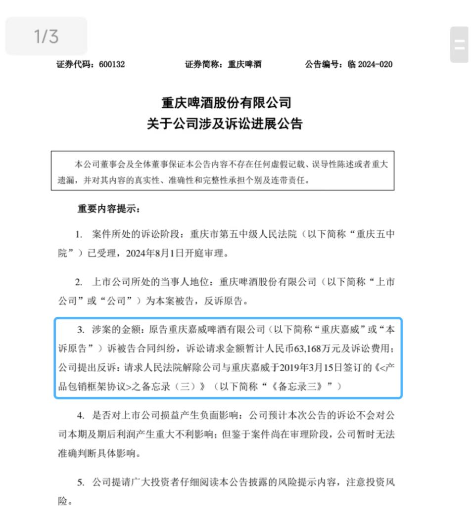 2020年9月,重庆嘉威将重庆啤酒告上法庭,认为重庆啤酒违法《包销协议》约定的相关义务,对重庆啤酒等7家被告单位的索赔金额为6.39亿元,这一索赔标的后来增加至8.22亿元。
