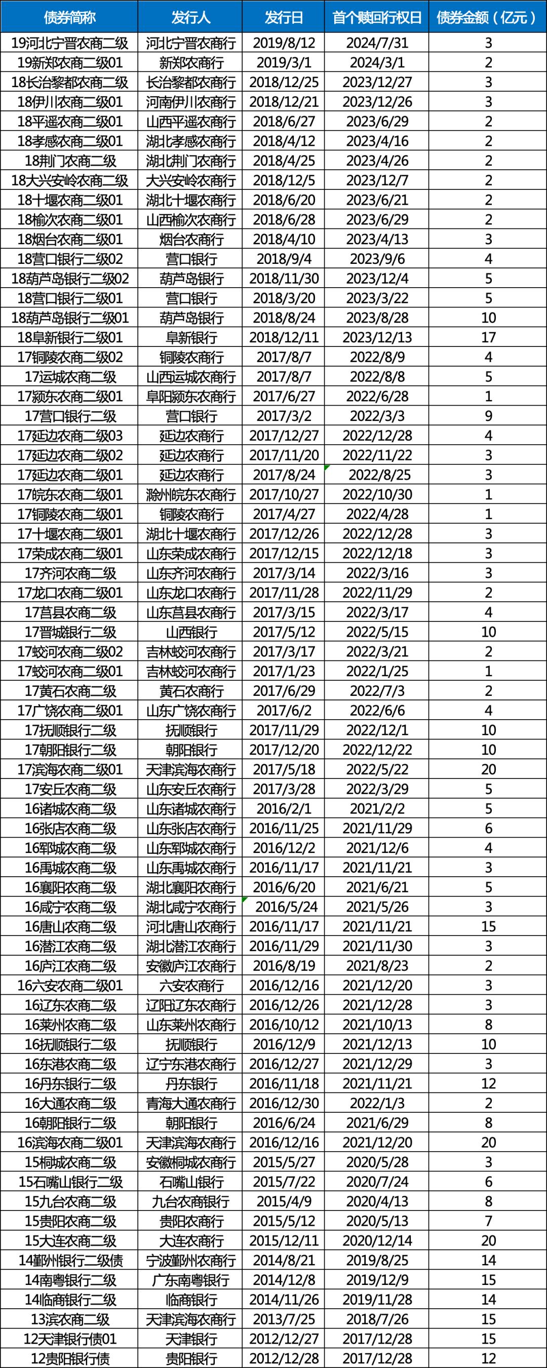 2024年的第一单为河南新郑农商行,其公告称不行使金额为两亿元的“19新郑农商二级01”的赎回选择权。第二单为河北宁晋农商行的“19河北宁晋农商二级”,金额有3亿元。