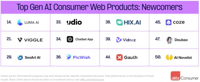 12家新上榜的公司中,58%来自创意工具领域。他们包括新上榜公司排名前五位中的四位:Luma(第14名)、Viggle(第21名)、SeaArt(第29名)、Udio(第33名)。