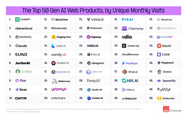 知名风投A16Z盘点Top50生成式AI应用:创意工具受到青睐,字节跳动不断发力