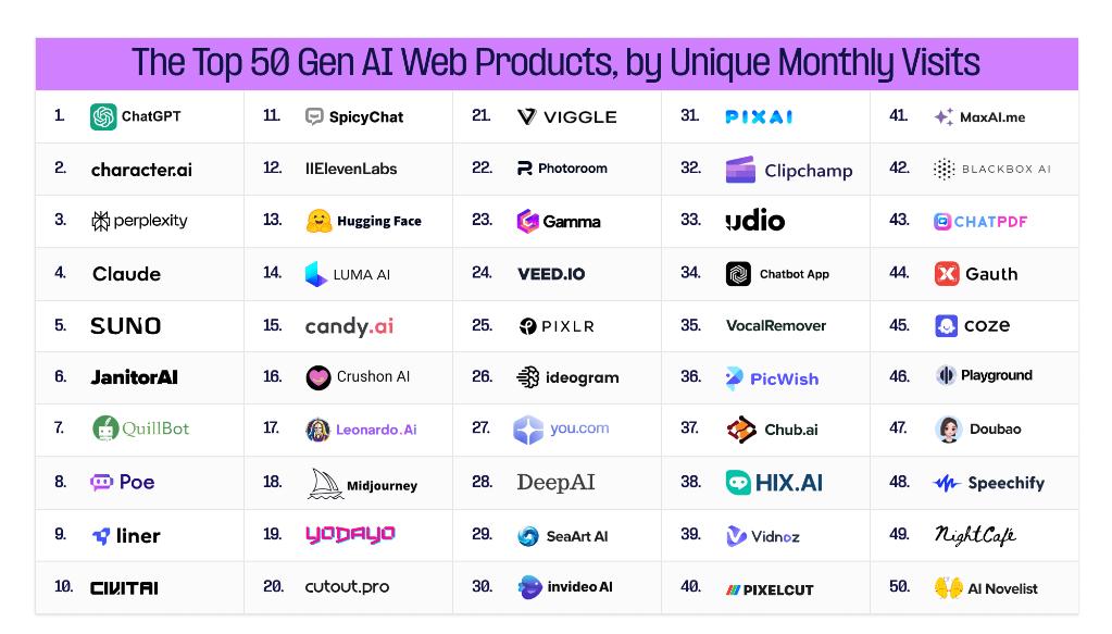 每六个月,知名风投A16Z都会对前50名基于Web的AI应用(按每月独立访问量)和前50名基于移动设备的AI应用(按每月活跃用户数)进行排名。与2024年3月的报告相比,这次的上榜公司近30%是新公司。
