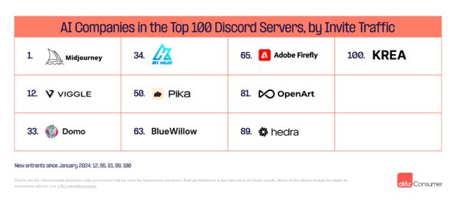 截至7月,有10家AI公司在所有Discord服务器的流量排名中进入了前100,与1月份相比,其中一半是新上榜者。