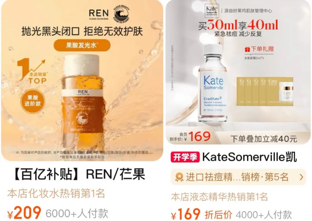 当前在淘宝平台REN的海外旗舰店显示共35款产品,其中,销量最高的果酸发光爽肤水仅6000+人付款。