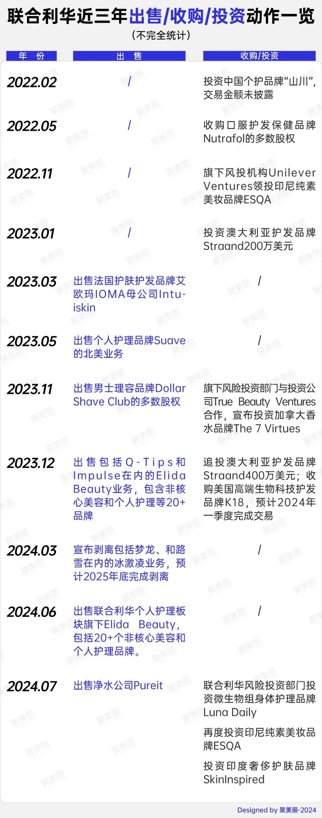 据聚美丽不完全统计,自2022年2月至今,联合利华发生了16起出售/收购/投资动作。