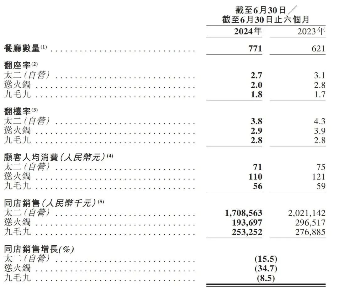 财报显示,九毛九旗下共有七个子品牌,其中今年上半年来自太二的收入为22.4亿元,较上年同期的21.8亿元增长2.7%;太二餐厅网络为614间餐厅,上年同期496间餐厅;被集团太二餐厅的翻台率及顾客人均消费下降部分抵销。