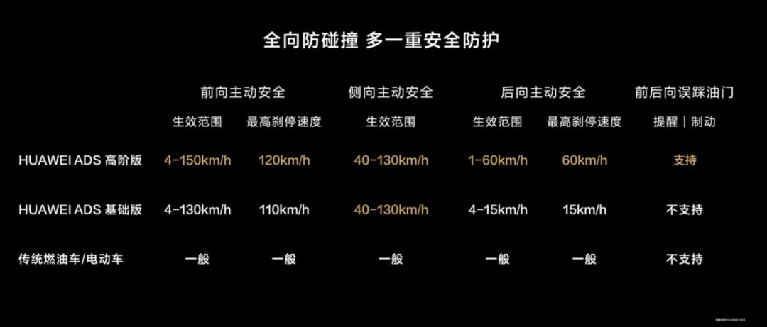 余承东进一步介绍称,基础版前向主动安全生效范围为4-130km/h、最高刹停速度110km/h;侧向主动安全生效范围为40-130km/h;后向主动安全生效范围为4-15km/h、最高刹停速度15km/h;不支持前后向的误踩油门。