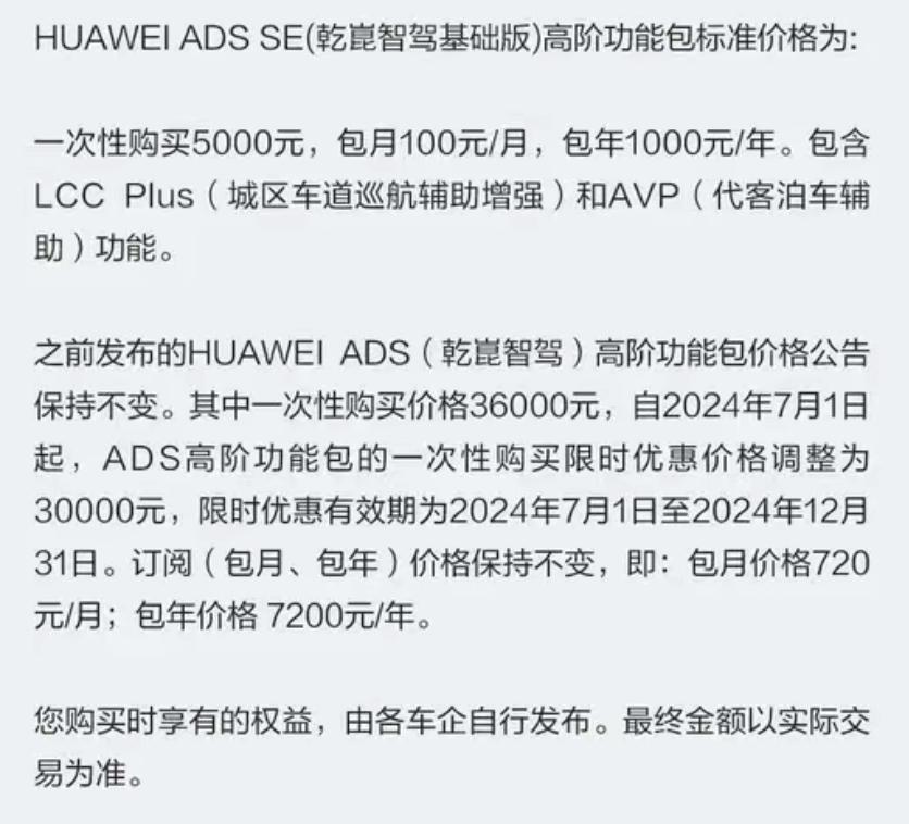 值得一提的是,发布会前一天,华为公布了HUAWEI ADS SE(智驾基础版)价格:一次性购买5000元,包月100元/月,包年1000元/年。包含LCC Plus(城区车道巡航辅助增强)和AVP(代客泊车辅助)功能。