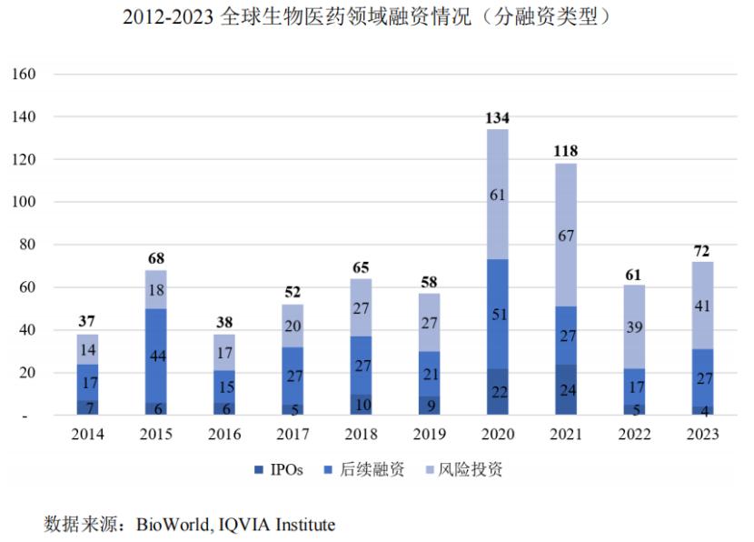 然而自2022年起,随着超额扰动因素的淡去,全球生物医药融资从高位较大幅度回落至约610亿美元。