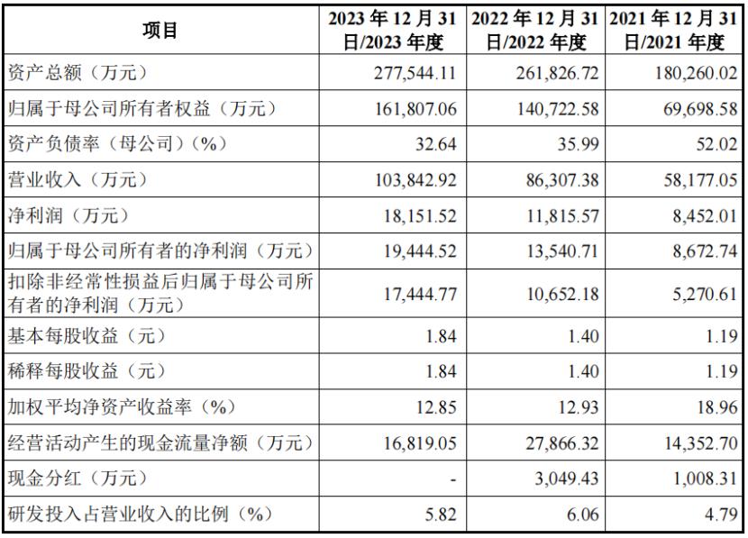 2021年、2022年及2023年(简称“报告期”),公司分别实现营业收入5.82亿元、8.63亿元及10.38亿元,三年复合增长率达到33.60%。同期净利润分别为8452.01万元、1.18亿元、1.82亿元。