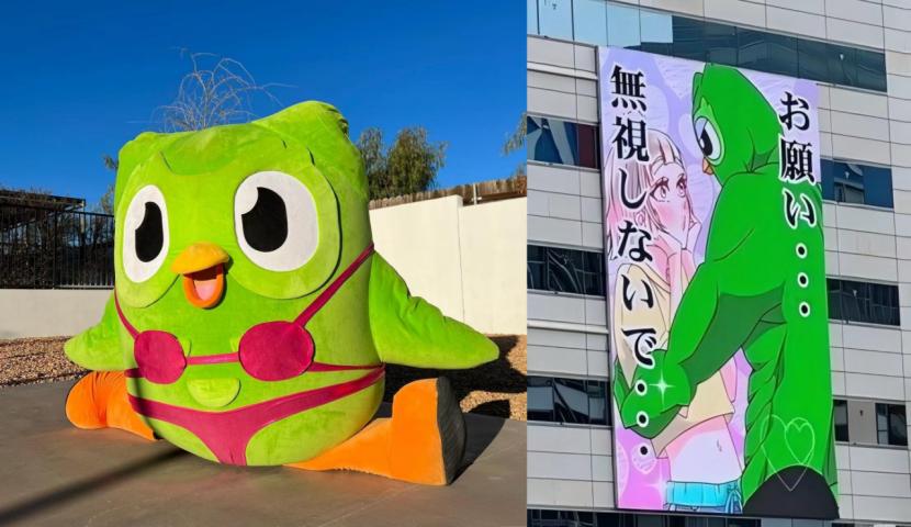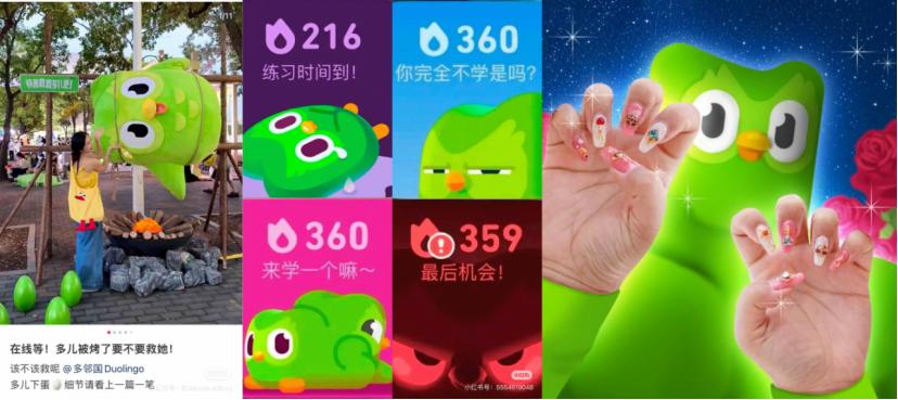 而在后续的互联网营销方面,多邻国走的是“抓马”的路线,蹭流量、玩烂梗,主打一个“鸟至贱则无敌”,或是工作人员扮演人偶表演“烤鸟”“下蛋”,或是让鸟头人身的玩偶服露出“腹肌”,又或是在推特对海外明星公开“调情”又“出轨”……其荒诞的营销手段带给用户新奇的体验,也奠定了多邻国不走寻常路的IP气质。