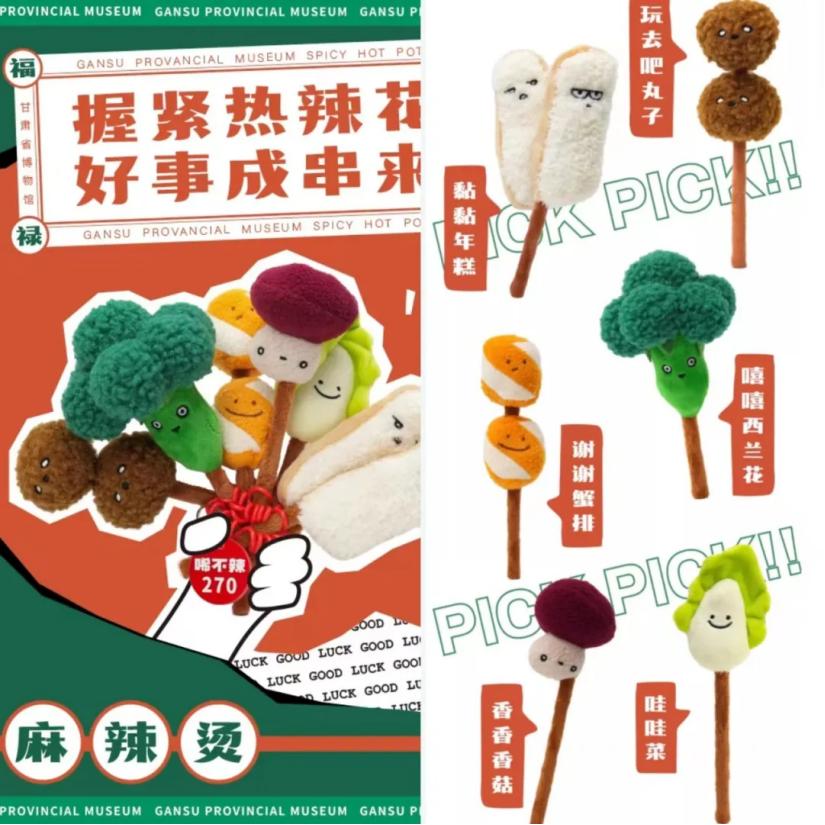 在文创IP领域,还有近期在网络爆火的甘肃省博物馆文创“麻辣烫”。甘肃省博物馆抓住前段时间火出圈的甘肃天水麻辣烫的热度,在博物馆的文创店卖起了“麻辣烫”,将甘肃麻辣烫中的常见食材做成了毛绒玩具,一套69元的麻辣烫毛绒玩具中包含了丸子、年糕、蟹排、西兰花、香菇和娃娃菜共6件“菜品”。