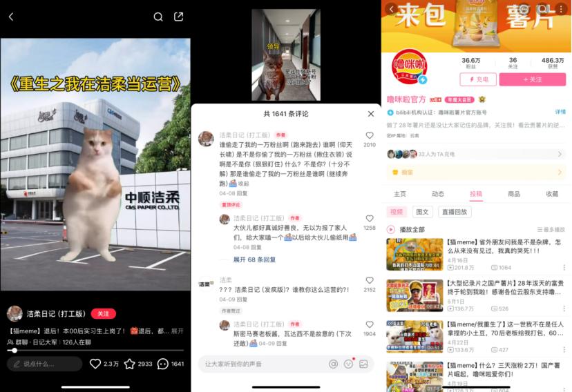 从这些品牌的实际的营销效果来看,破圈效果无疑是非常显著且容易复制的,“洁柔日记(打工版)”小红书新号凭借“猫meme”视频爆火,3天3条视频就涨粉1万;“足力健老人鞋”新号只凭1条视频就获得20万点赞;“正新鸡排”官号2天涨粉2万;薯片品牌“噜咪啦”B站账号一周粉丝暴涨10万……