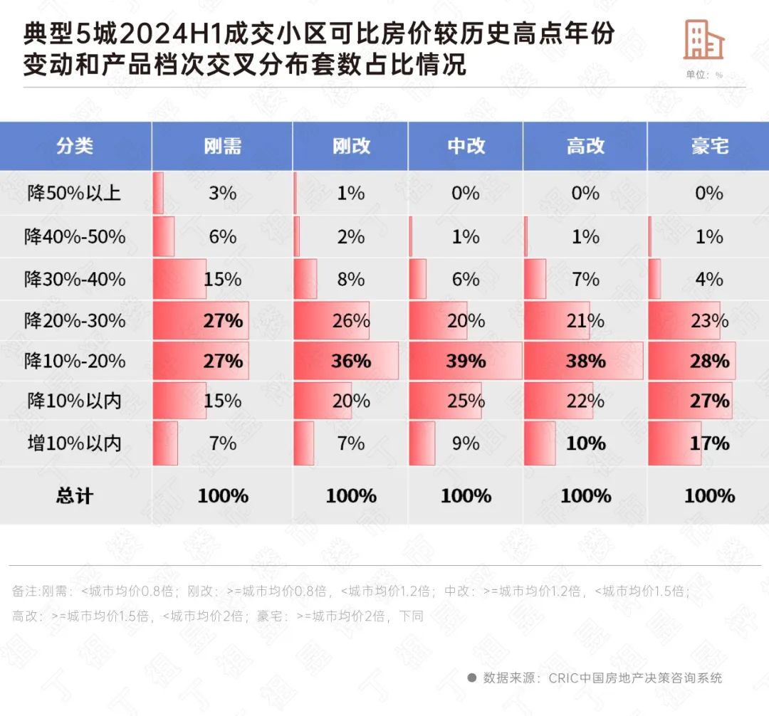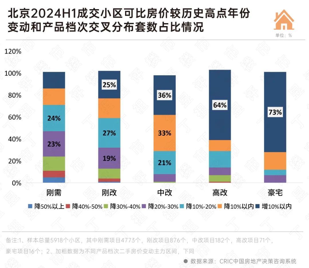 其中CRIC调研的北京5918个样本小区中,刚需、刚改产品多数小区跌幅在20%以内,上半年高改、豪宅产品多数项目房价不降反增,其中有七成以上二手豪宅上半年可比房价涨幅在10%以内,另外高改产品也有六成以上涨幅在10%以内。