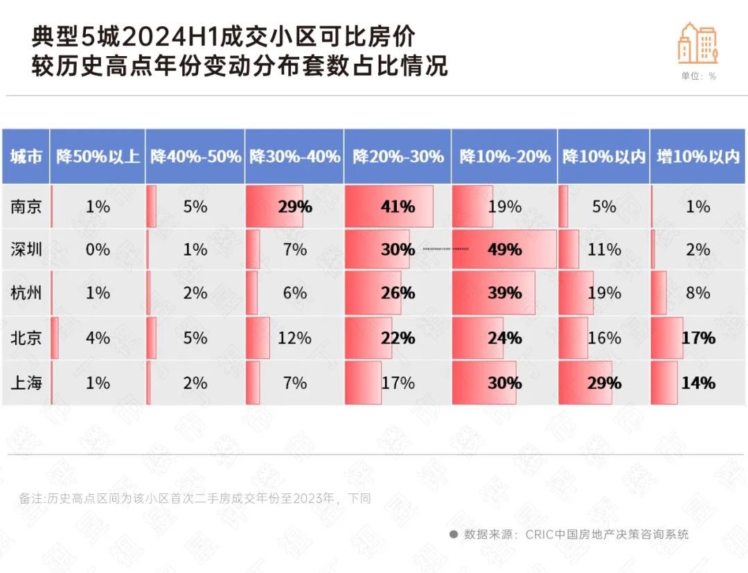 五个典型城市中,南京二手房价下探最明显,多数小区跌幅集中在20%-40%,增幅在10%以内的小区占比只有1%,调研的小区二手房价几乎全线下跌。