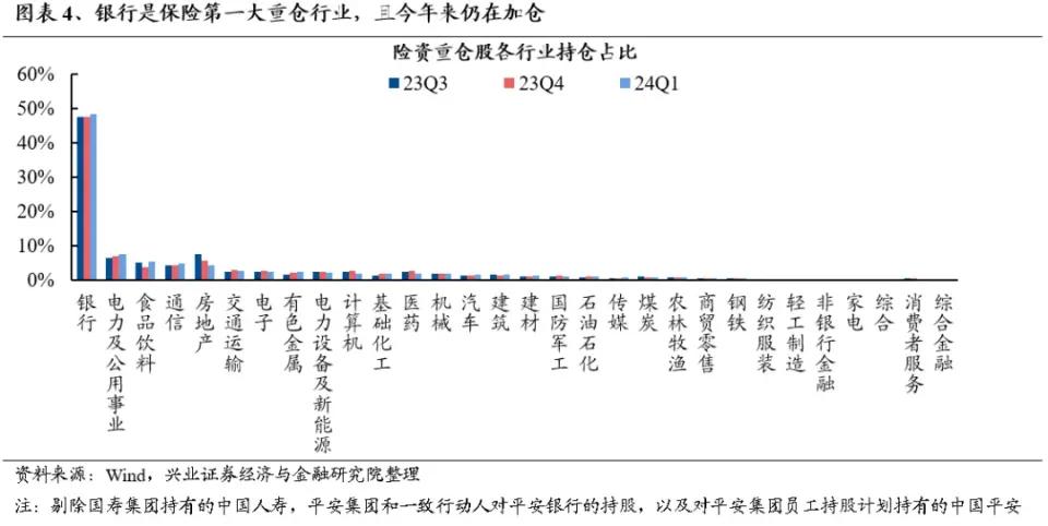 过去三个季度,银行股都是险资配置的重点对象,截至2024年一季报,险资重仓股中银行持仓占比高达48.3%,较年初提升0.8%,甚至陆续出现了部分银行被险资举牌的案例。譬如年初无锡银行就曾被长城人寿保险举牌,而上一次A股银行被险资举牌还要追溯到2015年。