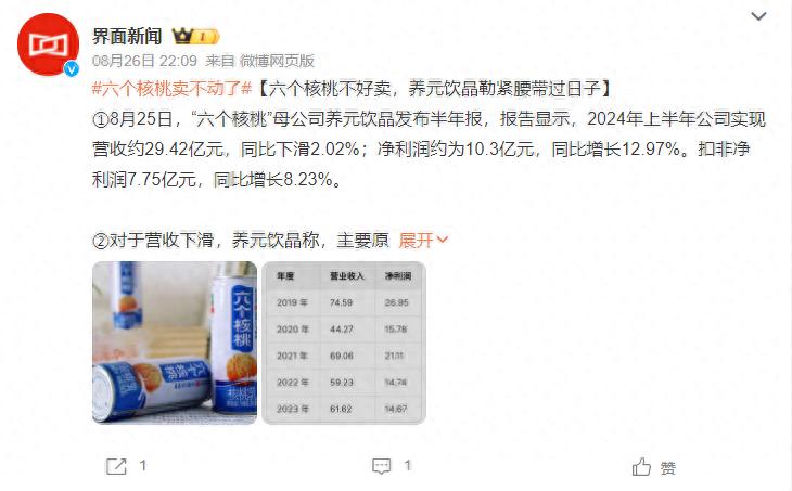 “经常用脑,多喝六个核桃”,直击用户痛点的广告语,让六个核桃成为了国内植物蛋白饮料行业的代表产品之一。近日,六个核桃母公司养元饮品发布了半年报。总营收同比下滑,引发外界质疑,六个核桃不好卖了?