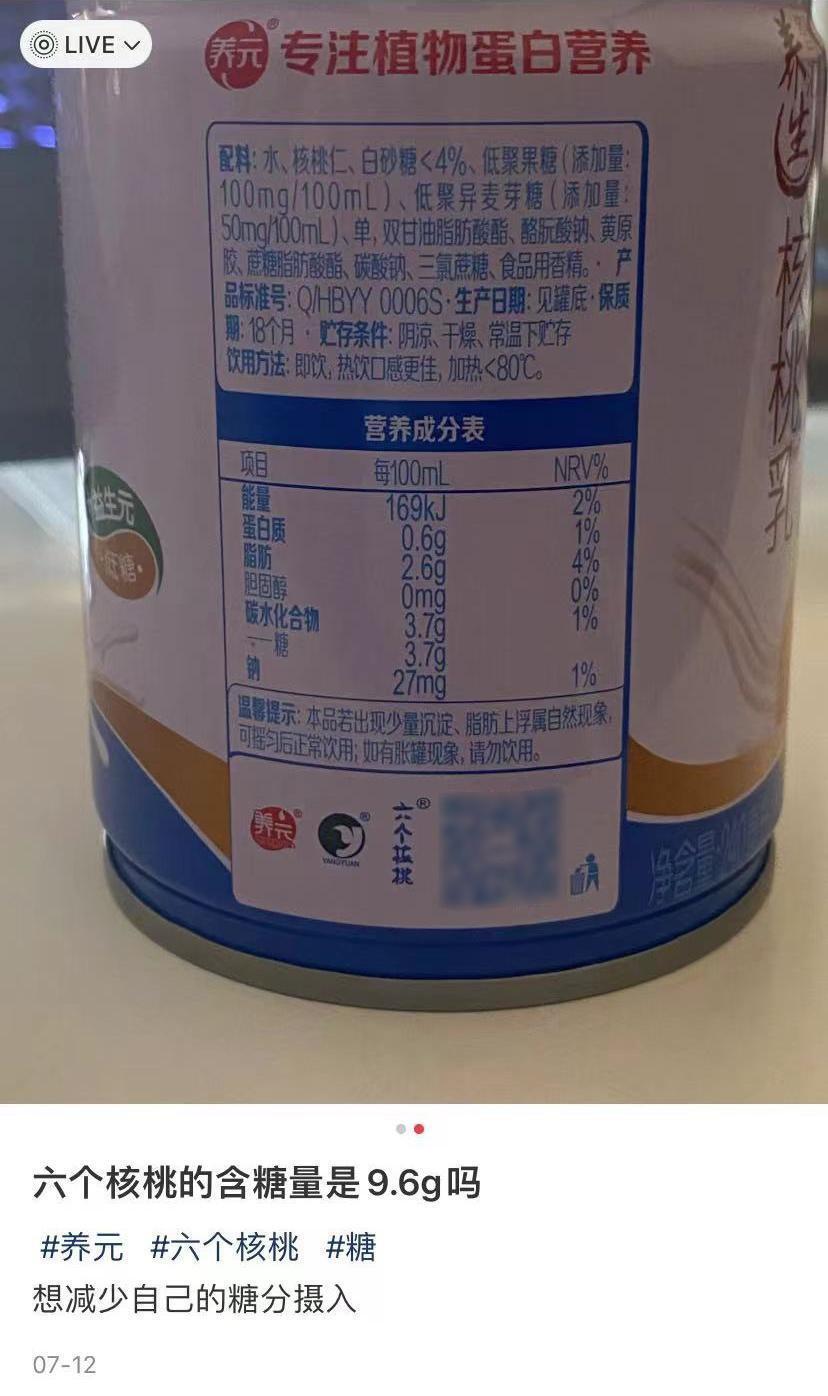 然而,面世近20年的六个核桃,正面临着产品老化的问题。随着健康的概念深入人心,含糖量成为了消费者选择饮品的重要考虑因素,但六个核桃知名度最广的一款产品,含糖量却不低。有网友发现,营养成分表显示,一款240ml的六个核桃,每100ml含糖3.7g,也就是说该产品共含糖8.8g。而有专家建议,成年人一天摄入的糖最好在25g左右。虽然养元饮品也推出了无糖版的六个核桃,但一电商平台显示,无糖版的销量不如含糖的精品型。